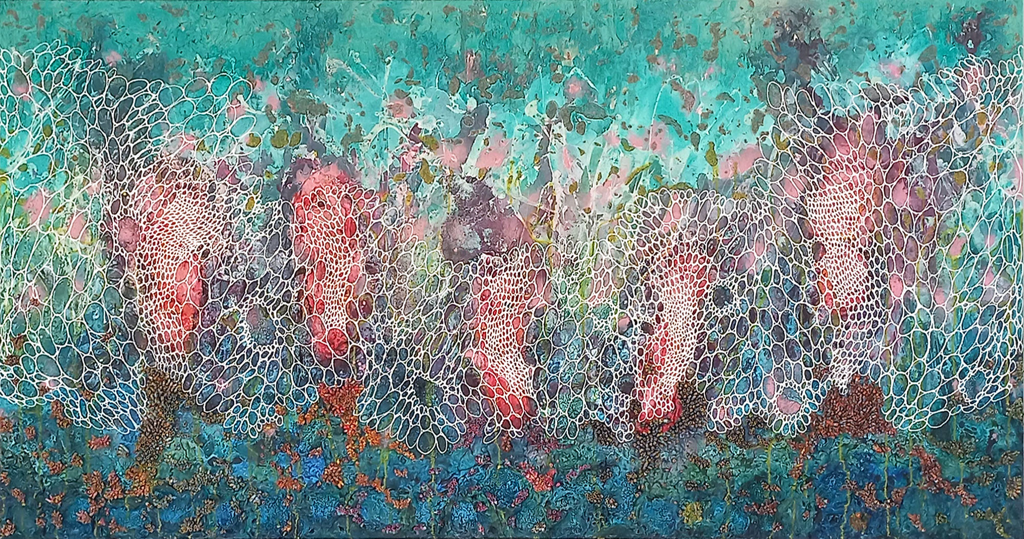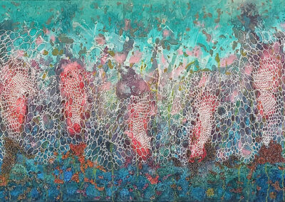Esta serie emerge de un tránsito entre dos profundidades: la del paisaje submarino y la de la interioridad. Las burbujas en forma de redes y las floraciones ascendentes que estructuran la serie no representan un motivo natural, sino un proceso interno de expansión, desbordamiento y renovación.